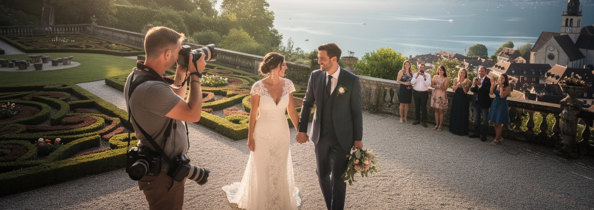 Pour des groupes importants, l’utilisation d’un point en surplomb (escalier, muret sécurisé) permet de dominer la scène et de voir chaque visage. Les professionnels habitués aux mariages à Annecy savent aussi prévoir un plan B en cas de météo instable, avec des emplacements couverts mais lumineux, afin de garantir des photos de groupe réussies quelles que soient les conditions.